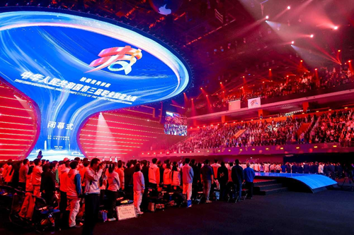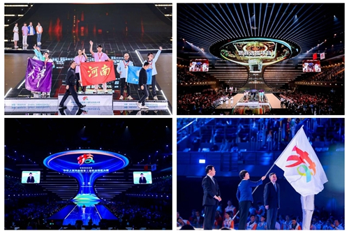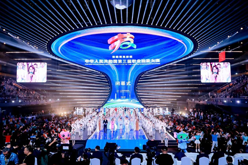 華燈璀璨,掌聲如潮。9月23日晚,當(dāng)348名獲獎(jiǎng)選手高舉隊(duì)旗與獎(jiǎng)?wù)拢?dāng)大賽會(huì)旗在璀璨的舞臺(tái)上完成交接傳遞,當(dāng)良渚文化和人形機(jī)器人在現(xiàn)場(chǎng)8000余名觀眾的歡呼聲中共舞……中華人民共和國(guó)第三屆職業(yè)技能大賽閉幕式在鄭州奧體中心體育館完美落幕!